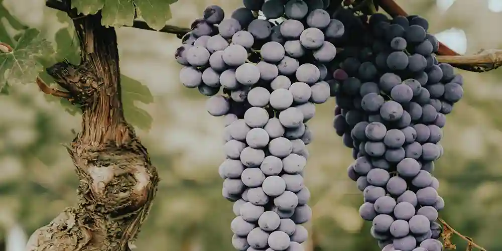 Die kompakten, zylindrischen bis konischen, 18 bis 20 cm langen Trauben sind oft mit einem Hügel versehen, der die Form einer zweiten Traube annehmen kann. Die kugeligen Beeren erreichen einen Durchmesser von 10 bis 14 mm und entwickeln eine feine, aber widerstandsfähige und stark tanninhaltige Haut von dunklem Rot, das wegen des reichlichen Reifs fast grau erscheint.