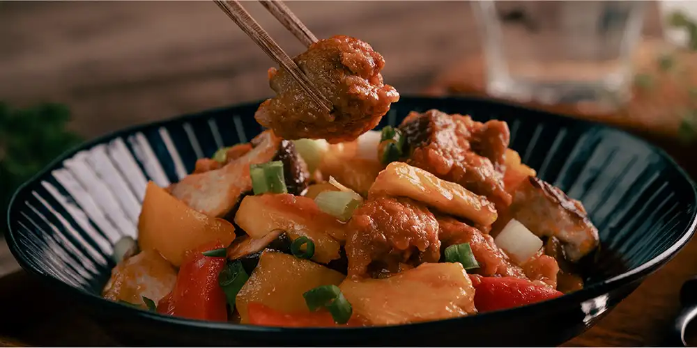 Mit knusprig gebratenem Hähnchenfleisch, das mit einer süss-sauren Sauce verfeinert wird, bietet Chicken Sweet & Sour eine faszinierende Vielfalt an Texturen und Geschmacksrichtungen. Die zarte und saftige Textur des Hühnchens harmoniert perfekt mit der intensiven und ausgewogenen Sauce, die aus hochwertigen Zutaten und Gewürzen hergestellt wird. Mit einem ausgewählten Wein wird das Gericht abgerundet.